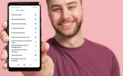 Set and manage global system configurations, including multi-login restrictions, partial payment rules, dues priority, and detailed permissions like displaying mark sheets or limiting access for students with pending fees.
